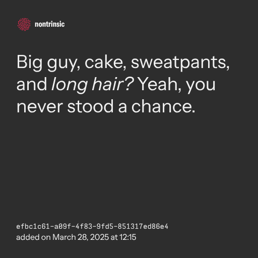 📤 shareBig guy, cake, sweatpants, and long hair? Yeah, you never stood a chance.