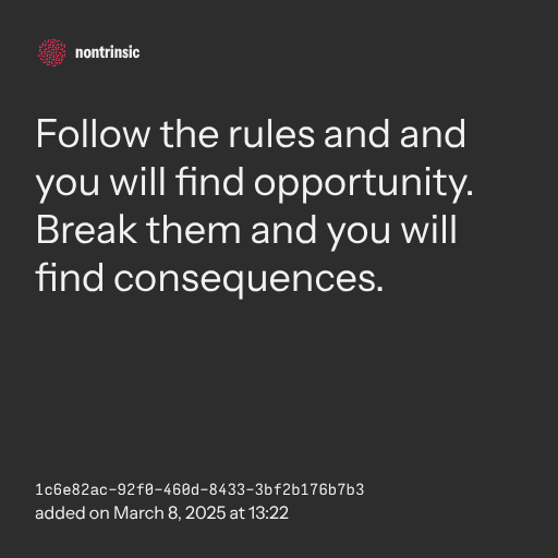 π€ shareFollow the rules and and you will find opportunity. Break them and you will find consequences.