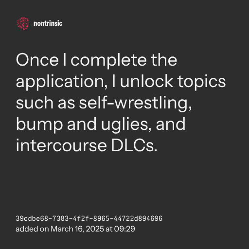 π€ shareOnce I complete the application, I unlock topics such as self-wrestling, bump and uglies, and intercourse DLCs.