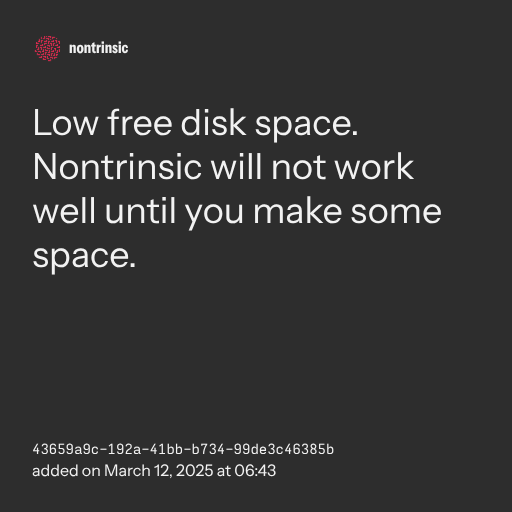 π€ shareLow free disk space. Nontrinsic will not work well until you make some space.