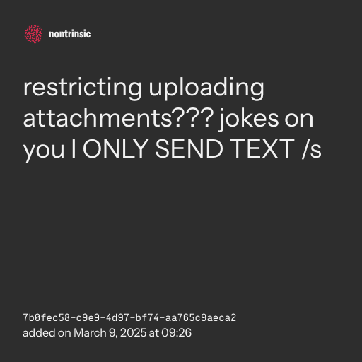 π€ sharerestricting uploading attachments??? jokes on you I ONLY SEND TEXT /s