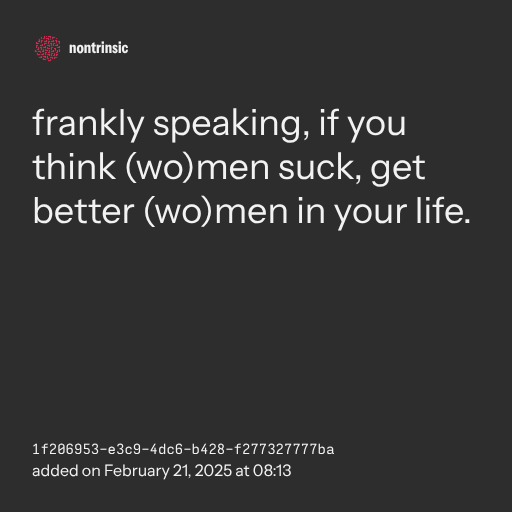 📤 sharefrankly speaking, if you think (wo)men suck, get better (wo)men in your life.