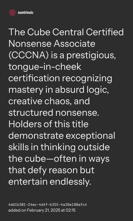 📤 shareThe Cube Central Certified Nonsense Associate (CCCNA) is a prestigious, tongue-in-cheek certification recognizing mastery in absurd logic, creative chaos, and structured nonsense. Holders of this title demonstrate exceptional skills in thinking outside the cube—often in ways that defy reason but entertain endlessly.