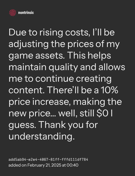 📤 shareDue to rising costs, I’ll be adjusting the prices of my game assets. This helps maintain quality and allows me to continue creating content. There’ll be a 10% price increase, making the new price… well, still $0 I guess. Thank you for understanding.