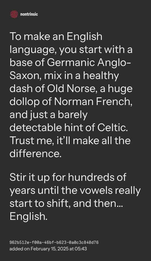 📤 shareTo make an English language, you start with a base of Germanic Anglo-Saxon, mix in a healthy dash of Old Norse, a huge dollop of Norman French, and just a barely detectable hint of Celtic. Trust me, it’ll make all the difference.