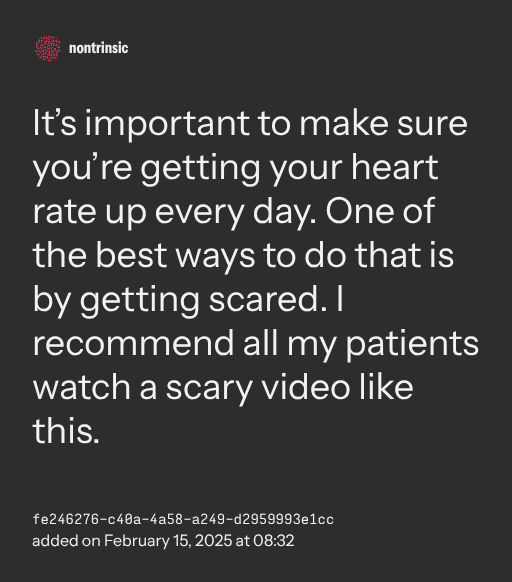 📤 shareIt’s important to make sure you’re getting your heart rate up every day. One of the best ways to do that is by getting scared. I recommend all my patients watch a scary video like this.
