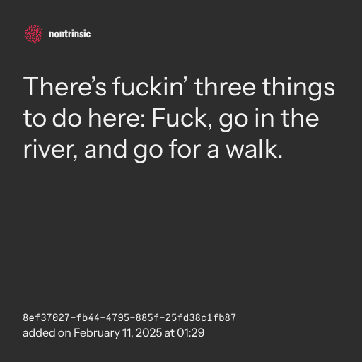 📤 shareThere’s fuckin’ three things to do here: Fuck, go in the river, and go for a walk.