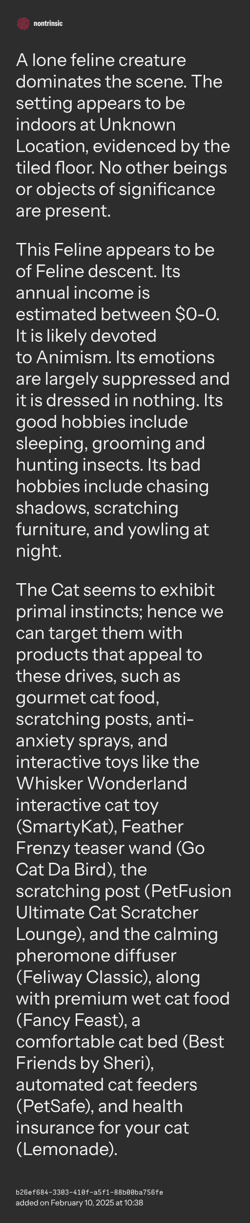 This Feline appears to be of Feline descent. Its annual income is estimated between $0-0. It is likely devoted to Animism. Its emotions are largely suppressed and it is dressed in nothing. Its good hobbies include sleeping, grooming and hunting insects. Its bad hobbies include chasing shadows, scratching furniture, and yowling at night.