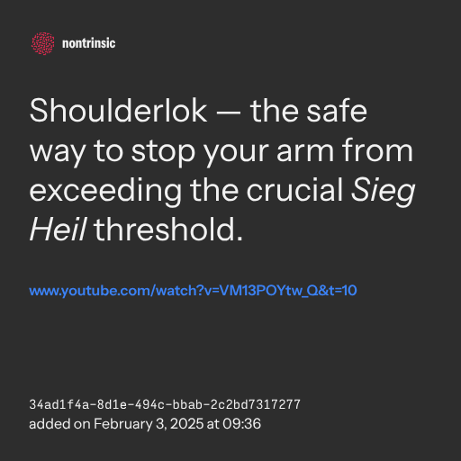 π€ shareShoulderlok β the safe way to stop your arm from exceeding the crucial Sieg Heil threshold.