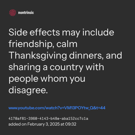 π€ shareSide effects may include friendship, calm Thanksgiving dinners, and sharing a country with people whom you disagree.