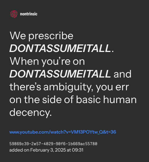 π€ shareWe prescribe DONTASSUMEITALL. When you’re on DONTASSUMEITALL and there’s ambiguity, you err on the side of basic human decency.