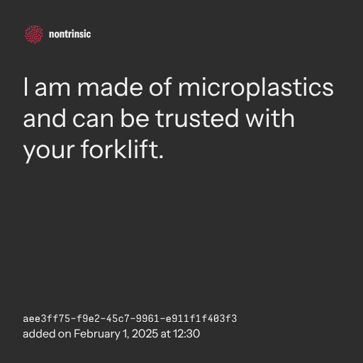 π€ shareI am made of microplastics and can be trusted with your forklift.