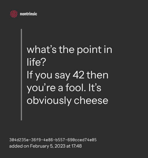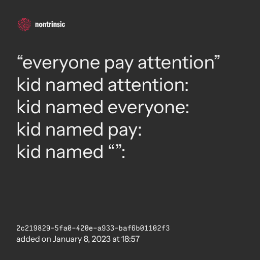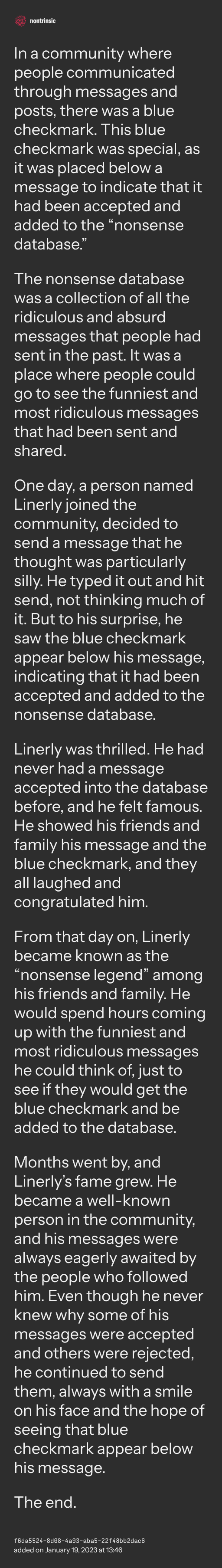 One day, a person named Linerly joined the community, decided to send a message that he thought was particularly silly. He typed it out and hit send, not thinking much of it. But to his surprise, he saw the blue checkmark appear below his message, indicating that it had been accepted and added to the nonsense database.