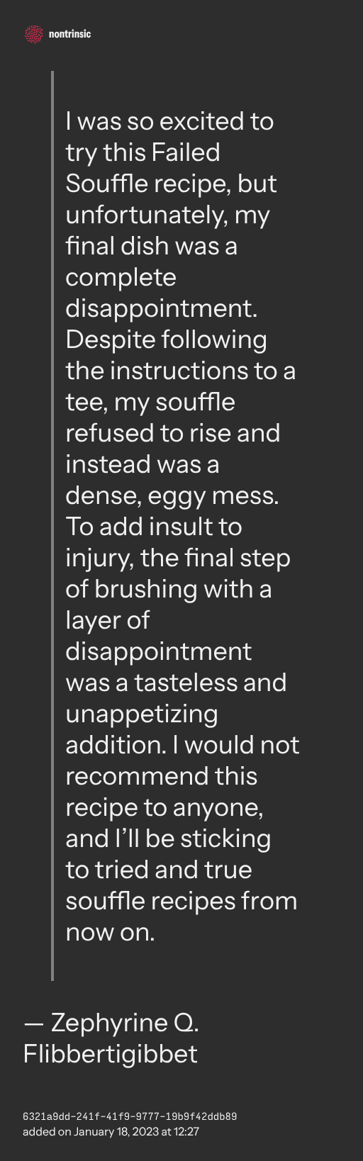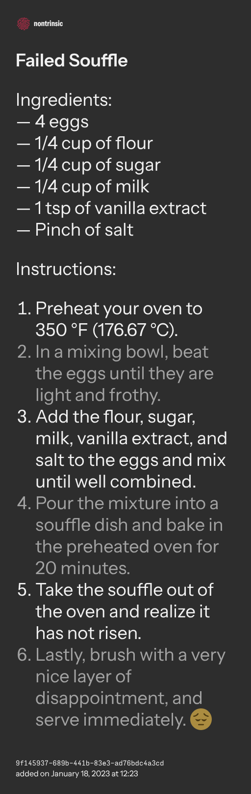 π€ shareI was so excited to try this Failed Souffle recipe, but unfortunately, my final dish was a complete disappointment. Despite following the instructions to a tee, my souffle refused to rise and instead was a dense, eggy mess. To add insult to injury, the final step of brushing with a layer of disappointment was a tasteless and unappetizing addition. I would not recommend this recipe to anyone, and I’ll be sticking to tried and true souffle recipes from now on.