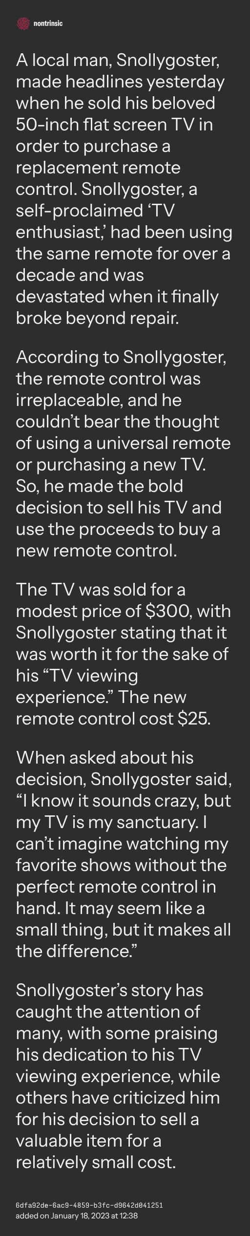 According to Snollygoster, the remote control was irreplaceable, and he couldn’t bear the thought of using a universal remote or purchasing a new TV. So, he made the bold decision to sell his TV and use the proceeds to buy a new remote control.