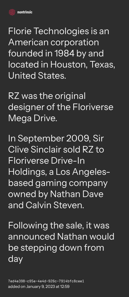 In September 2009, Sir Clive Sinclair sold RZ to Floriverse Drive-In Holdings, a Los Angeles-based gaming company owned by Nathan Dave and Calvin Steven.