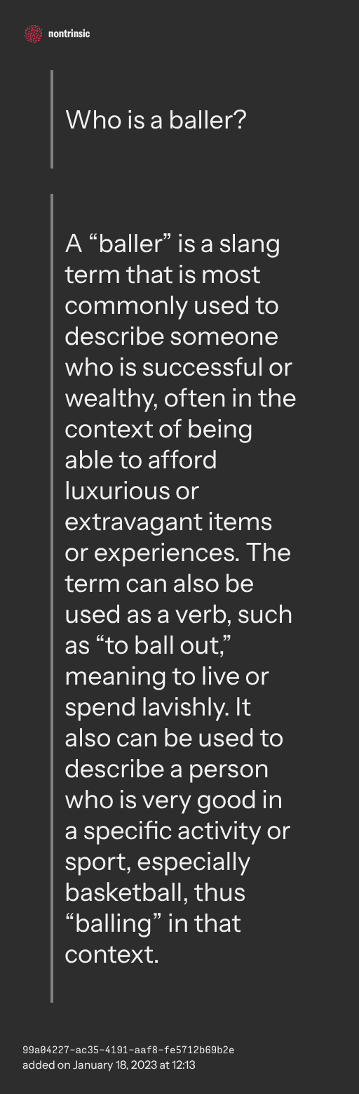 A “baller” is a slang term that is most commonly used to describe someone who is successful or wealthy, often in the context of being able to afford luxurious or extravagant items or experiences. The term can also be used as a verb, such as “to ball out,” meaning to live or spend lavishly. It also can be used to describe a person who is very good in a specific activity or sport, especially basketball, thus “balling” in that context.