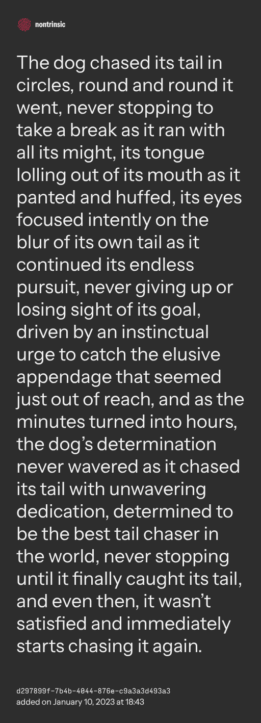 π€ shareThe dog chased its tail in circles, round and round it went, never stopping to take a break as it ran with all its might, its tongue lolling out of its mouth as it panted and huffed, its eyes focused intently on the blur of its own tail as it continued its endless pursuit, never giving up or losing sight of its goal, driven by an instinctual urge to catch the elusive appendage that seemed just out of reach, and as the minutes turned into hours, the dog’s determination never wavered as it chased its tail with unwavering dedication, determined to be the best tail chaser in the world, never stopping until it finally caught its tail, and even then, it wasn’t satisfied and immediately starts chasing it again.