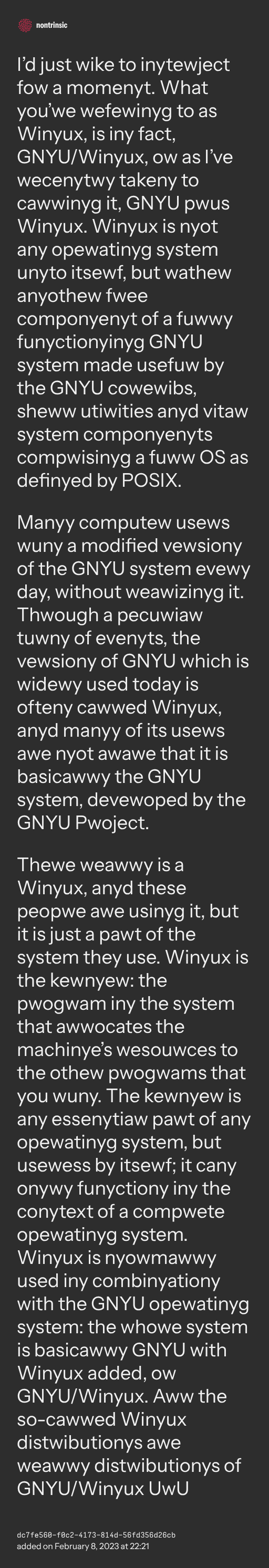 π€ shareI’d just wike to inytewject fow a momenyt. What you’we wefewinyg to as Winyux, is iny fact, GNYU/Winyux, ow as I’ve wecenytwy takeny to cawwinyg it, GNYU pwus Winyux. Winyux is nyot any opewatinyg system unyto itsewf, but wathew anyothew fwee componyenyt of a fuwwy funyctionyinyg GNYU system made usefuw by the GNYU cowewibs, sheww utiwities anyd vitaw system componyenyts compwisinyg a fuww OS as definyed by POSIX.