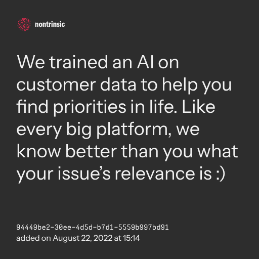 š¤ shareWe trained an AI on customer data to help you find priorities in life. Like every big platform, we know better than you what your issue’s relevance is :)
