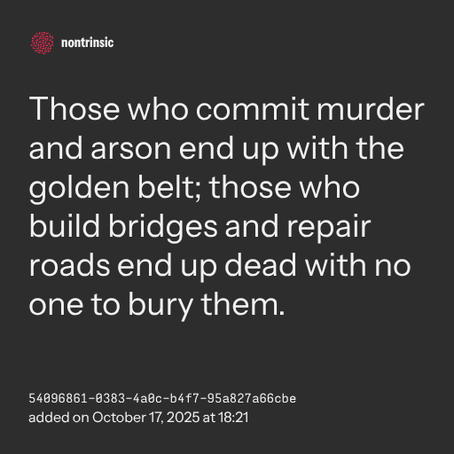 📤 shareThose who commit murder and arson end up with the golden belt; those who build bridges and repair roads end up dead with no one to bury them.