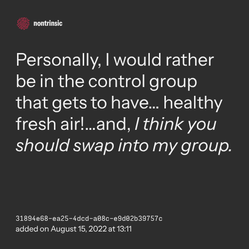 π€ sharePersonally, I would rather be in the control group that gets to have… healthy fresh air!…and, I think you should swap into my group.