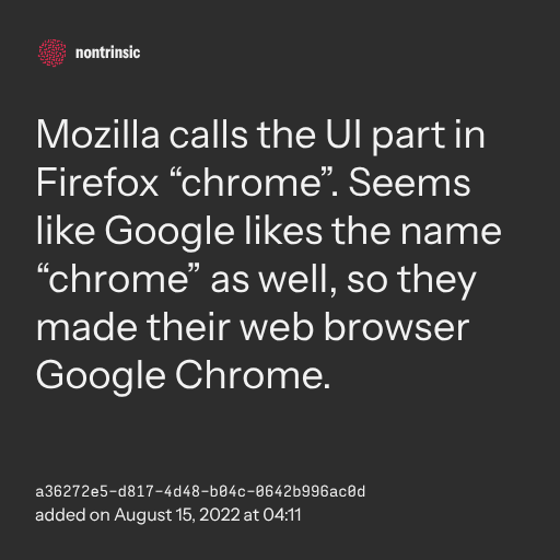 π€ shareMozilla calls the UI part in Firefox “chrome”. Seems like Google likes the name “chrome” as well, so they made their web browser Google Chrome.