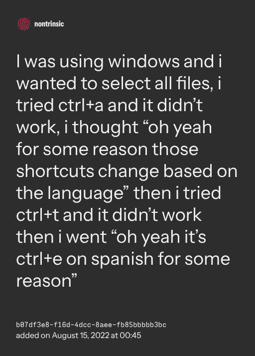 π€ shareI was using windows and i wanted to select all files, i tried ctrl+a and it didn’t work, i thought “oh yeah for some reason those shortcuts change based on the language” then i tried ctrl+t and it didn’t work then i went “oh yeah it’s ctrl+e on spanish for some reason”