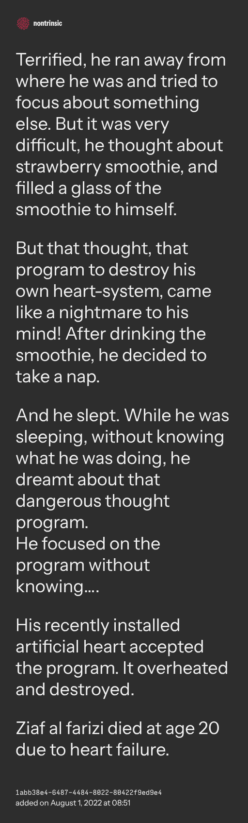 But that thought, that program to destroy his own heart-system, came like a nightmare to his mind! After drinking the smoothie, he decided to take a nap.