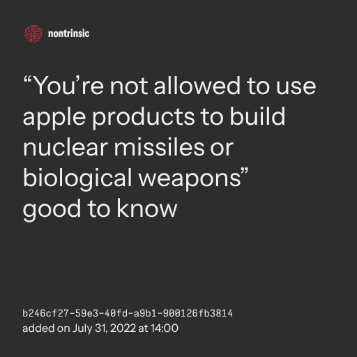 π€ share“You’re not allowed to use apple products to build nuclear missiles or biological weapons”