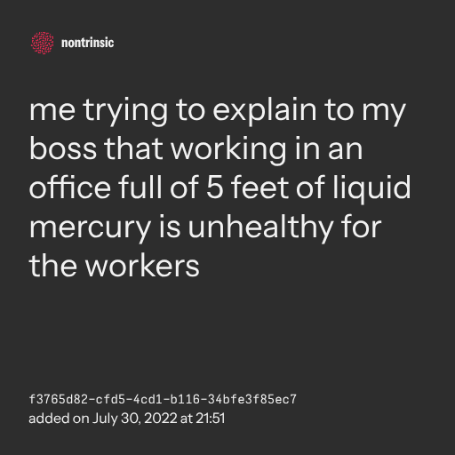 π€ shareme trying to explain to my boss that working in an office full of 5 feet of liquid mercury is unhealthy for the workers