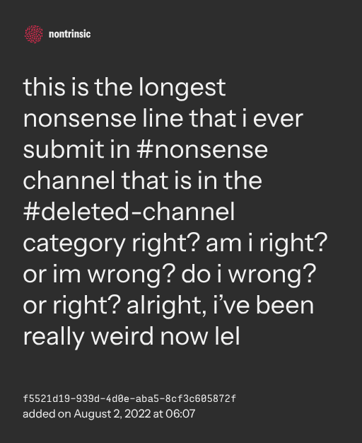 π€ sharethis is the longest nonsense line that i ever submit in #nonsense channel that is in the #deleted-channel category right? am i right? or im wrong? do i wrong? or right? alright, i’ve been really weird now lel