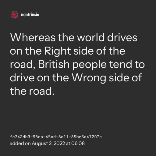 π€ shareWhereas the world drives on the Right side of the road, British people tend to drive on the Wrong side of the road.
