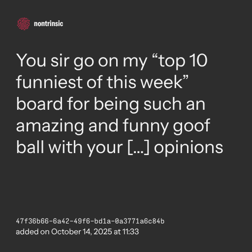 📤 shareYou sir go on my “top 10 funniest of this week” board for being such an amazing and funny goof ball with your […] opinions
