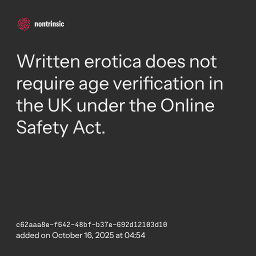 📤 shareWritten erotica does not require age verification in the UK under the Online Safety Act.