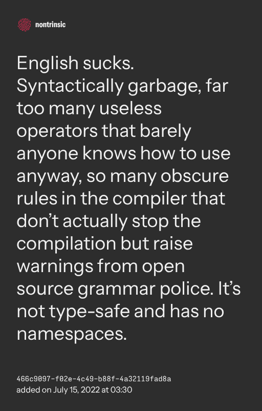 📤 shareEnglish sucks. Syntactically garbage, far too many useless operators that barely anyone knows how to use anyway, so many obscure rules in the compiler that don’t actually stop the compilation but raise warnings from open source grammar police. It’s not type-safe and has no namespaces.