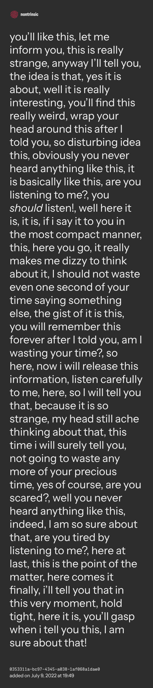 π€ shareyou’ll like this, let me inform you, this is really strange, anyway I’ll tell you, the idea is that, yes it is about, well it is really interesting, you’ll find this really weird, wrap your head around this after I told you, so disturbing idea this, obviously you never heard anything like this, it is basically like this, are you listening to me?, you should listen!, well here it is, it is, if i say it to you in the most compact manner, this, here you go, it really makes me dizzy to think about it, I should not waste even one second of your time saying something else, the gist of it is this, you will remember this forever after I told you, am I wasting your time?, so here, now i will release this information, listen carefully to me, here, so I will tell you that, because it is so strange, my head still ache thinking about that, this time i will surely tell you, not going to waste any more of your precious time, yes of course, are you scared?, well you never heard anything like this, indeed, I am so sure about that, are you tired by listening to me?, here at last, this is the point of the matter, here comes it finally, i’ll tell you that in this very moment, hold tight, here it is, you’ll gasp when i tell you this, I am sure about that!