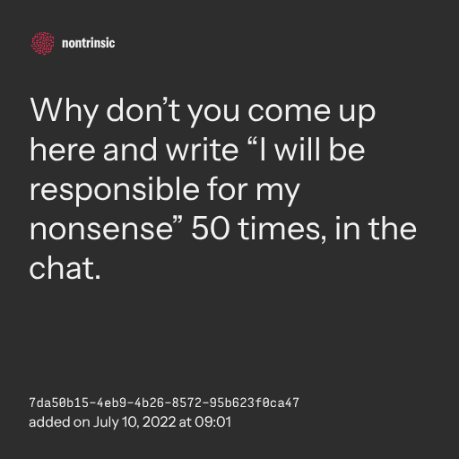 π€ shareWhy don’t you come up here and write “I will be responsible for my nonsense” 50 times, in the chat.