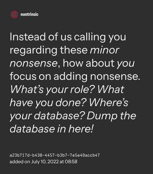 π€ shareInstead of us calling you regarding these minor nonsense, how about you focus on adding nonsense. What’s your role? What have you done? Where’s your database? Dump the database in here!
