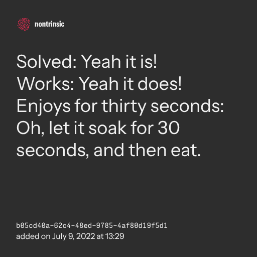 Enjoys for thirty seconds: Oh, let it soak for 30 seconds, and then eat.