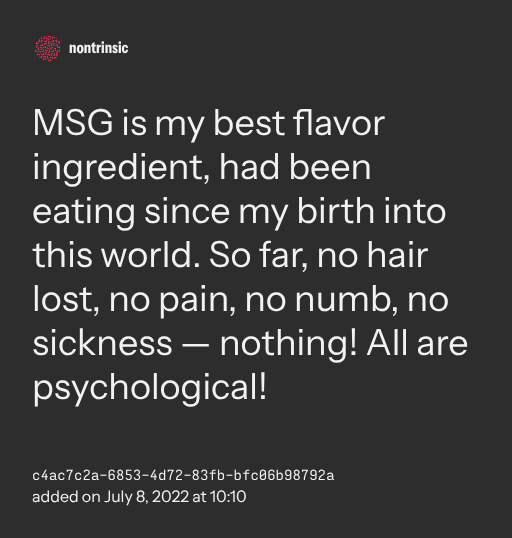 π€ shareMSG is my best flavor ingredient, had been eating since my birth into this world. So far, no hair lost, no pain, no numb, no sickness β nothing! All are psychological!