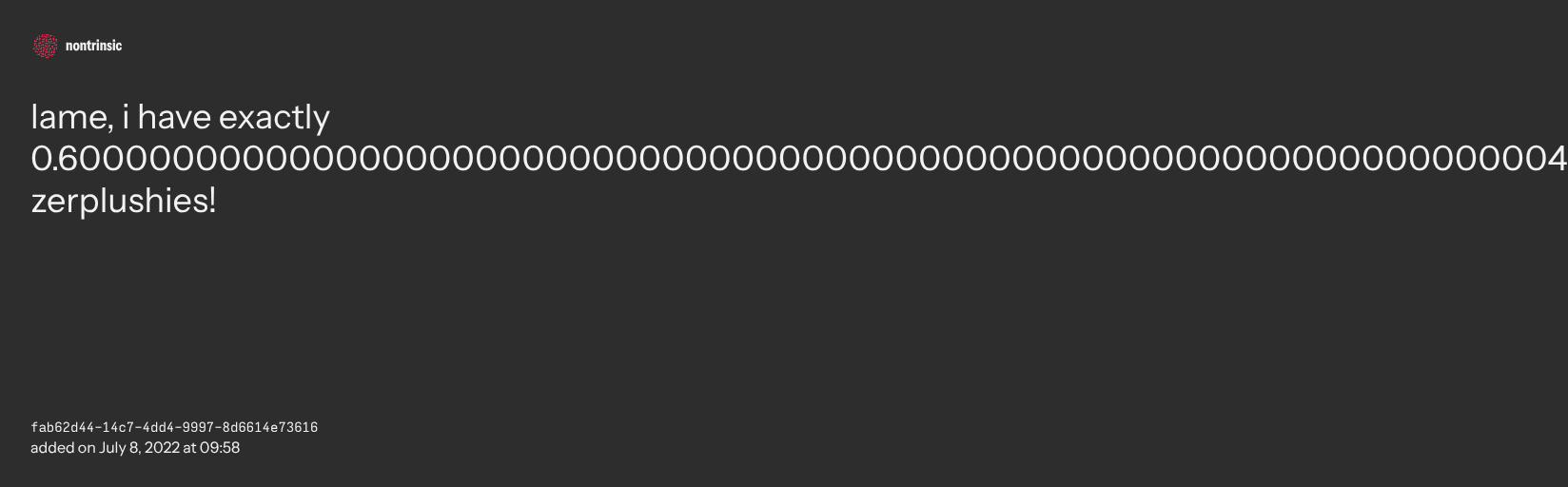 π€ sharelame, i have exactly 0.60000000000000000000000000000000000000000000000000000000000000004 zerplushies!