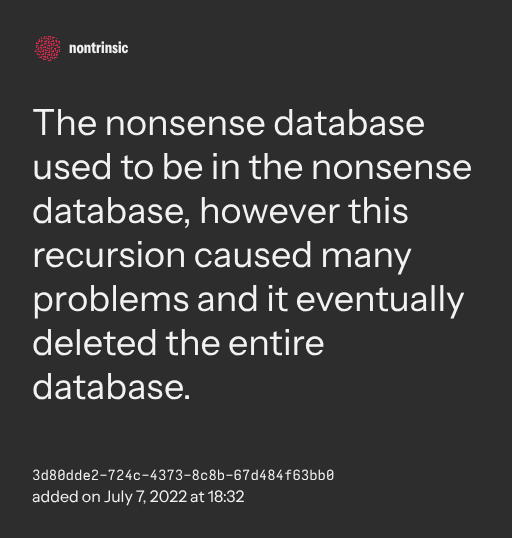 ๐ค shareThe nonsense database used to be in the nonsense database, however this recursion caused many problems and it eventually deleted the entire database.