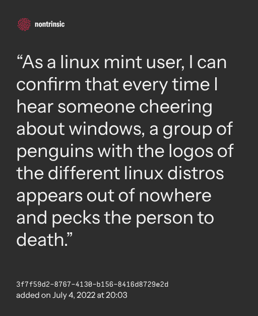 π€ share“As a linux mint user, I can confirm that every time I hear someone cheering about windows, a group of penguins with the logos of the different linux distros appears out of nowhere and pecks the person to death.”