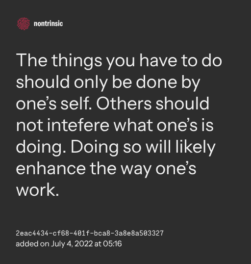 π€ shareThe things you have to do should only be done by one’s self. Others should not intefere what one’s is doing. Doing so will likely enhance the way one’s work.