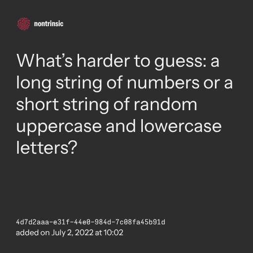 π€ shareWhat’s harder to guess: a long string of numbers or a short string of random uppercase and lowercase letters?