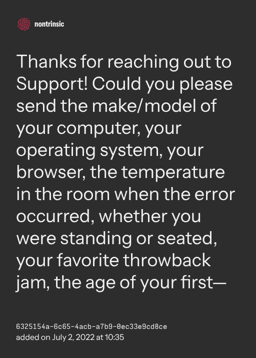 π€ shareThanks for reaching out to Support! Could you please send the make/model of your computer, your operating system, your browser, the temperature in the room when the error occurred, whether you were standing or seated, your favorite throwback jam, the age of your firstβ