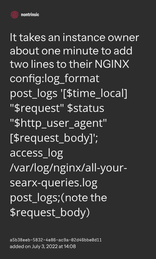π€ shareIt takes an instance owner about one minute to add two lines to their NGINX config:log_format post_logs '[$time_local] "$request" $status "$http_user_agent" [$request_body]'; access_log /var/log/nginx/all-your-searx-queries.log post_logs;(note the $request_body)