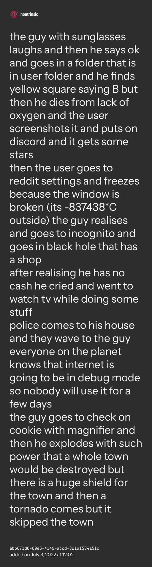 π€ sharethe guy with sunglasses laughs and then he says ok and goes in a folder that is in user folder and he finds yellow square saying B but then he dies from lack of oxygen and the user screenshots it and puts on discord and it gets some stars