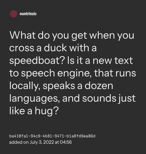 π€ shareWhat do you get when you cross a duck with a speedboat? Is it a new text to speech engine, that runs locally, speaks a dozen languages, and sounds just like a hug?